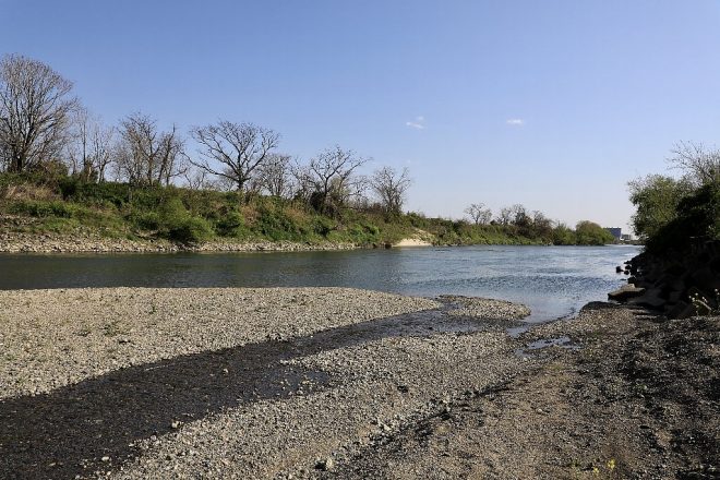 水無瀬川はやがて下流で桂川に流入。少し上流で宇治川と木津川が合流した淀川とさらに合流します。