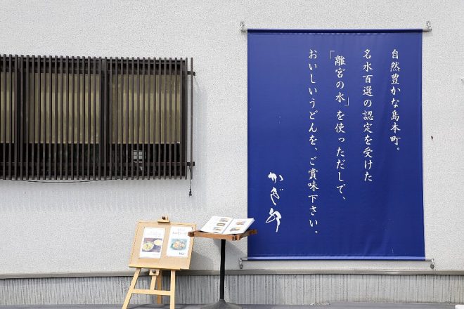 西国街道沿いに建つ一軒のうどん店を見つけました。看板によると、どうやら離宮の水を使った出汁をうどんに使っているとのこと、早速のれんをくぐってみることにしました。