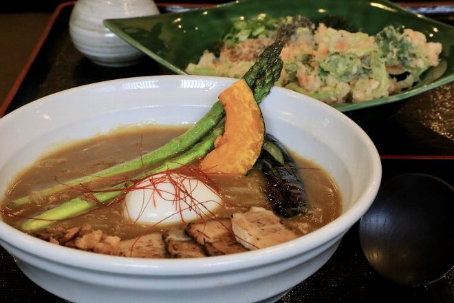 なんと創業100年というかぎ卯さん。三代目オーナーは創作うどんが得意だと聞いて、早速こがしカレーうどんと今が旬の桜エビをてんぷらにしたぶっかけうどんをオーダー。さぬきうどんのようなコシがありながら、ツルッとしたのどごし。カレー出汁でもぶっかけ出汁でも、まろやかな離宮の水の特徴を失うことなく引き継がれていました。ごちそうさまでした。