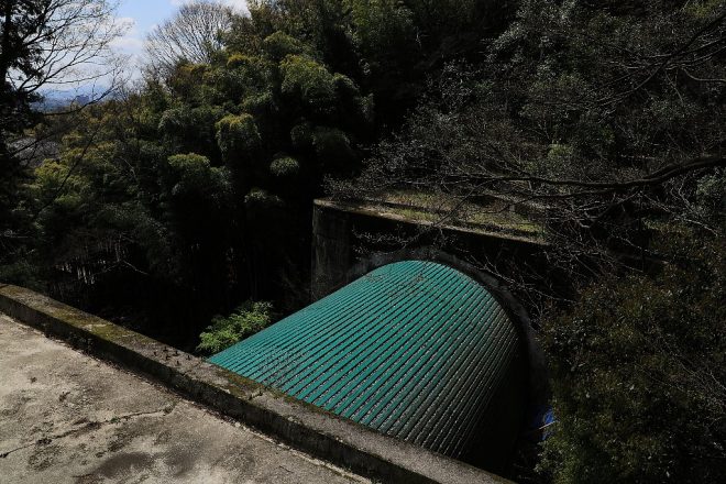少し山へ分け入ったところに、チューブ形状の建造物がありました。耳を澄ませると、ゴーゴーと音が聞こえています。これは何と名神高速道路・天王山トンネルの一部。ゴーゴーというのは、ひっきりなしにトンネル内を走る車の走行音でした。かつて名神高速道路の工事が行われた際、水に影響が出てはいけないとの配慮で計画変更を余儀なくされたとか。モータリゼーション華やかなりしころでも、こうした環境への配慮が忘れ去られることはなかったのです。