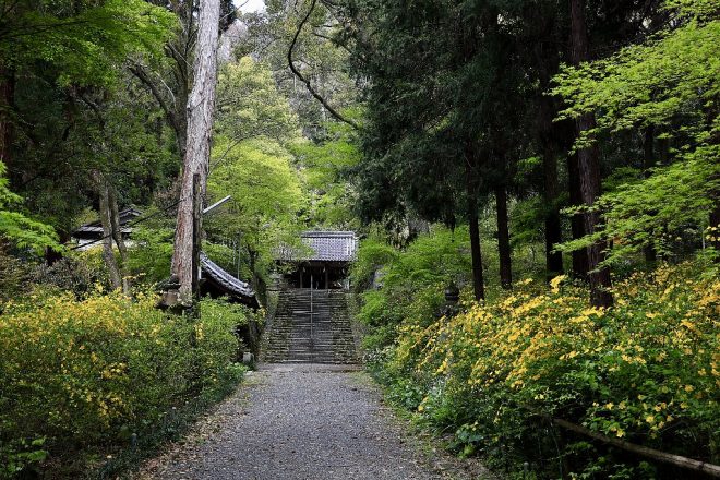 蒸溜所をさらに北へ行くと、椎尾神社が。境内にはヤマブキやシャガが咲き乱れ、うっそうとした雰囲気は駅前とはまったく違う異次元な空間を醸しだしています。