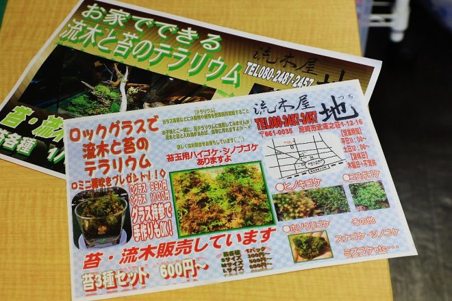 流木だけでなく山で自生している苔という存在を、多くのお客さんに知ってもらいたい。そんな思いがフライヤーにも詰まっています。自宅にいることが多くなりそうな昨今の生活様式の変化によって、苔テラリウムにじっくり取り組めるチャンスかも知れません。