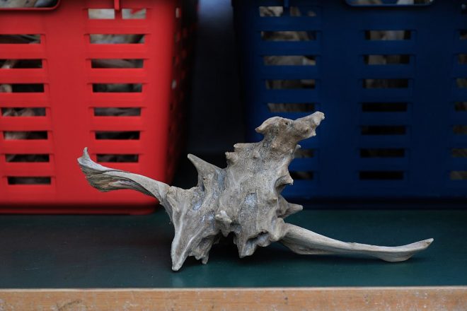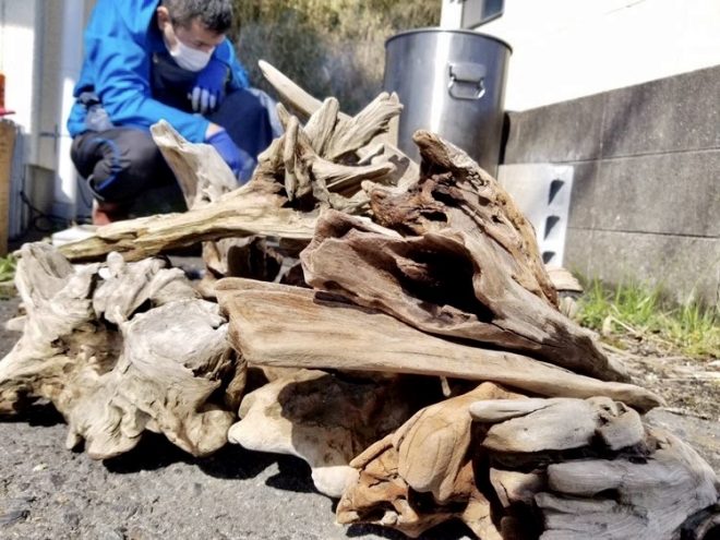 長めのゴム手袋は必須アイテム。いいのがある!と思っても、ほかの木やゴミと絡まってたりしたら?「あきらめます(笑)」。1回のハンティングでゲットする量は米袋でいうと3つくらい。上田さん自身が採取するのが基本ですが、地元のダム湖が流木を自由に持ち帰りできる配布会なるイベントに参加してゲットすることもあります。「ダムにたまる流木は管理者にとっては大量ゴミですから」。なるほど。廃棄処分するのにも手間もお金もかかってしまう。だったら欲しい人にあげましょうというわけで、配布期間の情報はSNSなどで入手し、現地に繰り出す流木マニアも結構いるそうです。