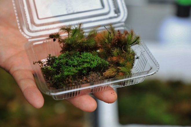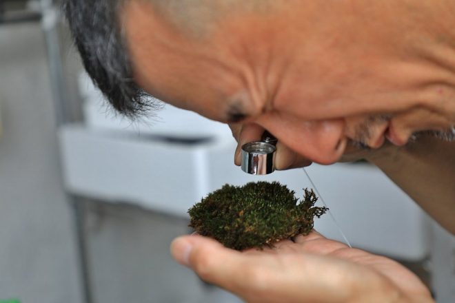 ここ1年の間に、苔テラリウムにも興味を持ち始めた上田さん。また何で(笑)?「流木を探しに山へ入ると、色々なコケと出会うんです。肉眼では見えない小さな世界ですが、ルーペで覗くとさらに広大で、ため息さえ出てしまう(笑)。流木とはまた違う大自然が、そこにあるんです」。