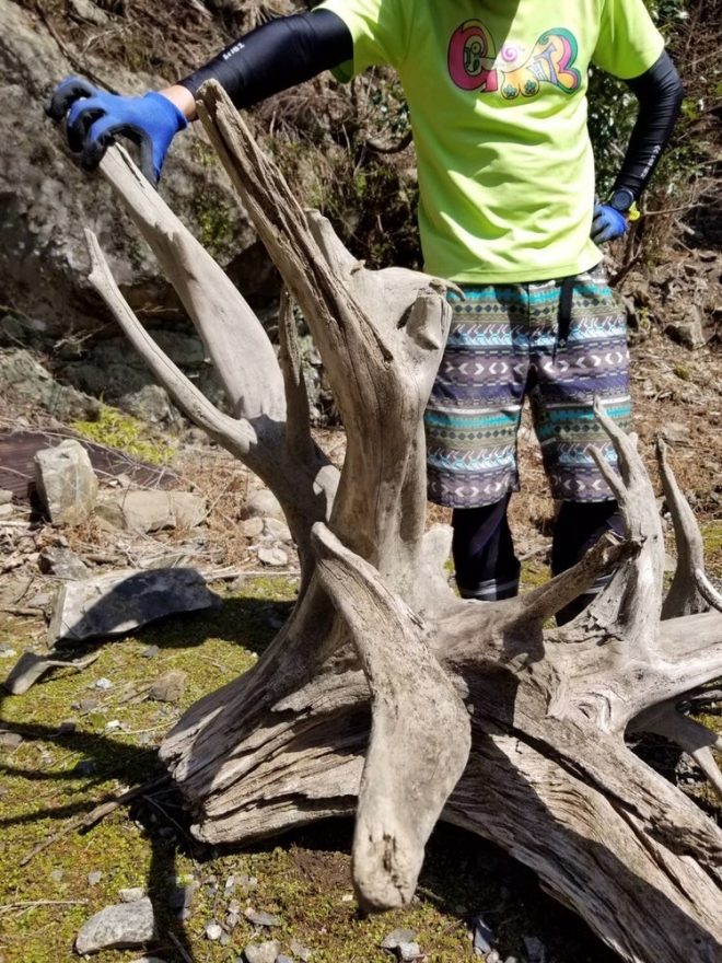 つい最近、こんな大物と出会いました。「いやあ、うれしかったですね」。流木なのに、なぜか生命力を感じる力強さ。どの部分にもダメージを与えることなく、無事ハンティングに成功したそうです。まさにしてやったり(笑)