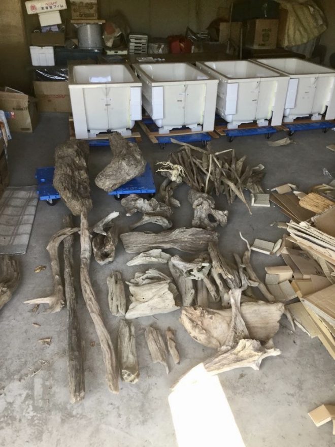 保管スペースもたっぷりあり、流木保管にもぴったり。奥に見えるのは使われなくなったバスタブ4つ。流木をゴシゴシ洗ったり重曹水での漬け込み作業をしたり、なくてはならない流木アイテムなんです。