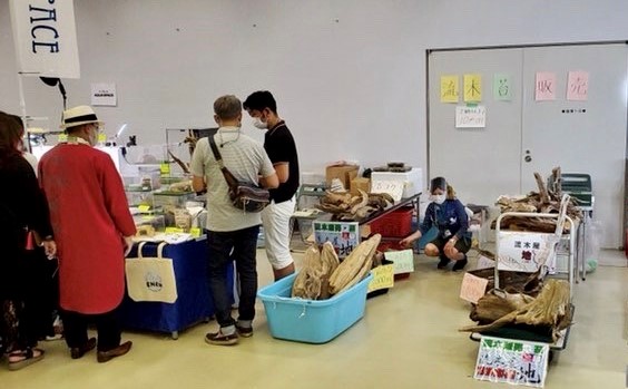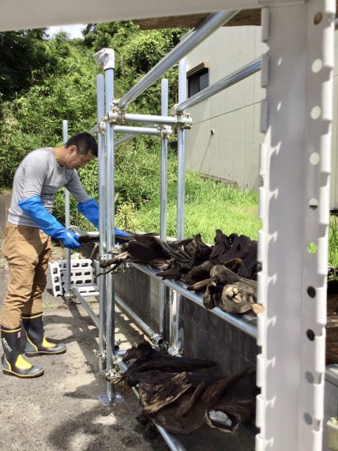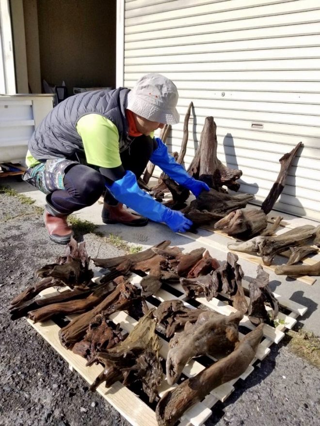 流木の最終段階が天日乾し。このために、上田さんは梅雨の合間を縫って何度も工房へ。この工程が終わったら、いよいよ流木も一人前。廃棄されてゴミになるはずだった木たちが、再び命を吹き込まれて第2の人生を歩きは始める記念すべき時でもあります。
