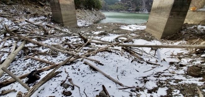 「はい、こちらは流木師の上田です(笑)」。とあるダム湖にて。流木のある斜面から広がる風景はちょっと幻想的。木を採取できる時期は意外に少なく、ダム湖の減水期となる11月から1~2月ごろの数カ月間のみ。ほかの時期となると、基本的にダム湖は満水状態ですから当然です。「夏は釣りのついでにダム湖に立ち寄ることもあるんですが、たまに水面からニヨッキリ突き出た木に一目惚れして、心を奪われることもあるんですよ」。ああ、犬神家の一族的な(笑)。未練たらたら帰路につき、改めて採取期に行ったら、「やっぱりもうなかったです」。でしょうね(笑)