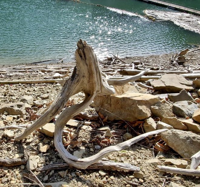 まるでヘビのような、龍のような。あ、上田さんがかつて飼育していた古代魚にも似てる!上田さんにとって流木採取は、拾うのではなく「出会い」なのだと。「ナラ、クヌギ、ブナ、ヒノキ、スギなど、木の種類は色々ですが、それらが川から流れてダム湖へたどり着いたことで出会えました。流木たちに最後の花道を与えた上田さん、あっぱれです。