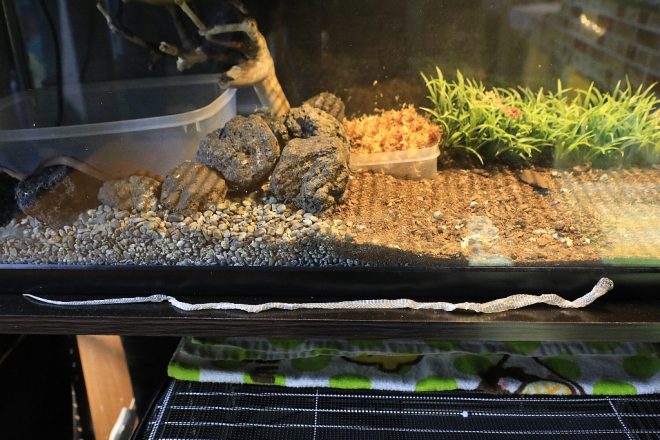 水槽の手前にあるのは、最近脱皮した際の過去が。流水があって、流木があって、適宜緑もあって。アクアテラリウムという言い方はすっかり定着しましたが、これからは「アクアヘビリウム」というジャンルが新たに登場するかも知れませんね(笑)。
