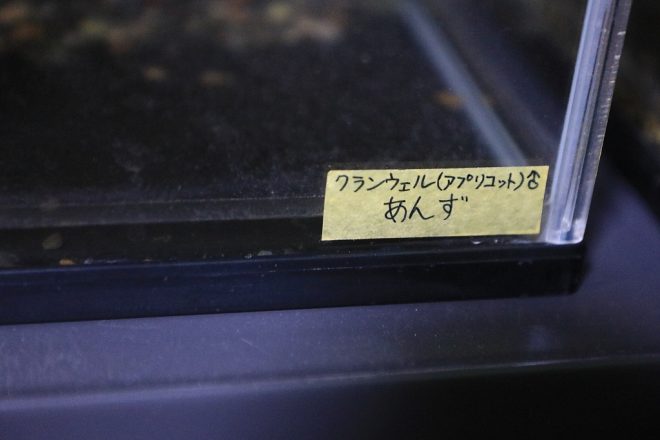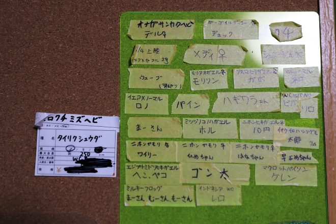 すべての飼育ケースやケージには付箋のようなものが貼られています。何と、すべての動物には名前がつけられているんです。105匹すべてに。ただし統一感なし(笑)。