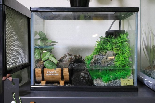さてこちらの飼育環境は、一般的なケージではなく水槽が中心。水槽でエキゾ系を飼育するのもちょっと珍しい気が。よく見ると、ほとんどの水槽にはアクアで使われているミニポンプなどを使って流水がつくられています。パッと見ではアクアテラリウムのような雰囲気。「決して演出のためではないんですよ。生きものたちにとって、より自然に近い環境をつくりつつ、湿度を保つためにも必要だからなんです。もちろん流水をつくることで、動物たちにとってこれは水だという認識も生まれるんです」。まさに命の水。そんな工夫が心憎い限りです。