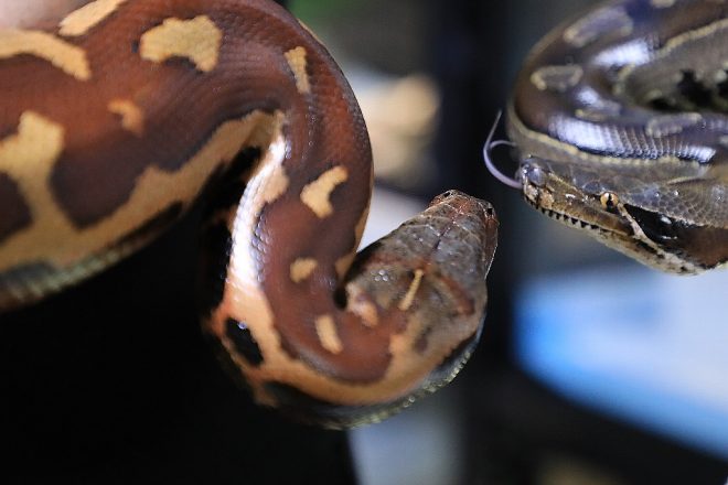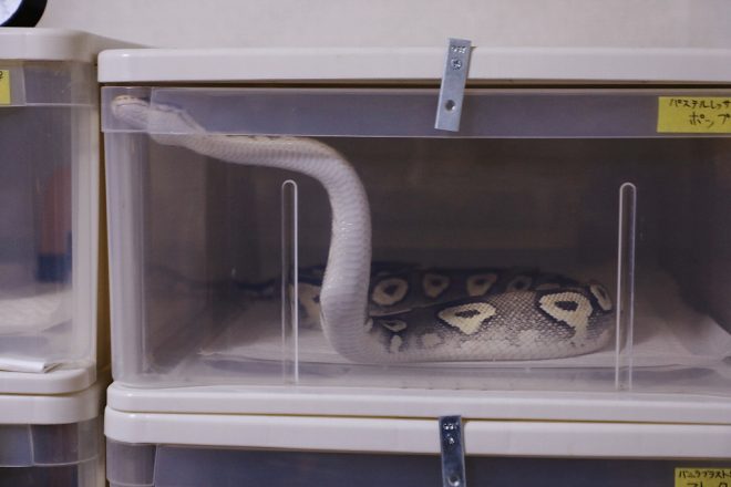 2人が今最も注目しているのは、ペアのブラッドパイソン。何とかブリードを成功させようと、取り組んでいます。「もともとインドネシアが原産地なので、雨季や乾季という環境が必要なんです。まずは発情のタイミングが一番大事なんですが、相性もあります。また、たとえ抱卵したからといって産卵するとも限りません。難易度がかなり高いのでしょう、繁殖の前例もいまだにないんです」。ということは、もしブリードに成功したら日本初の快挙ということになります。これはぜひ注目しておきたいですね。