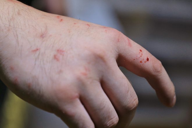 色鮮やかな真っ赤な体色が印象的なヘビ。あのハブでも歯が立たないといわれる史上最強のヘビとして知られるアカマタ。もちろん毒はありませんが、奄美大島や沖縄に分布し性格は極めて凶暴。見た目の印象から「ハバネロ」とネーミングされていますが、なんのなんのピリリと辛いレベルではありません(笑)。この子は慣れました?「いやいや、さすがになかなか手強いです」と龍ノ輔さん。「でも大丈夫ですよ」と、ニコニコしながらハバネロを引っ張り出して再びケースに戻したあと腕を見たら。。。