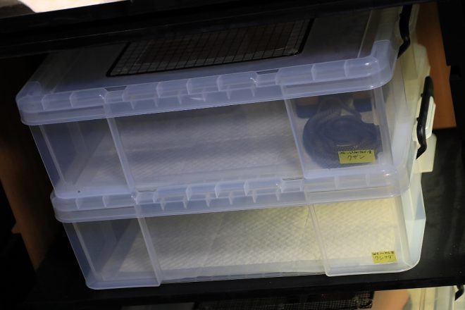 オールプラ製の飼育ケースがスタッキング。もちろんセキュリティー体制は万全。「それは基本中の基本ですから怠ることはありません」。先日アミメニシキヘビが逃走したニュースが全国を駆けめぐりましたが、龍ノ輔さんにとっても人ごとではありません。