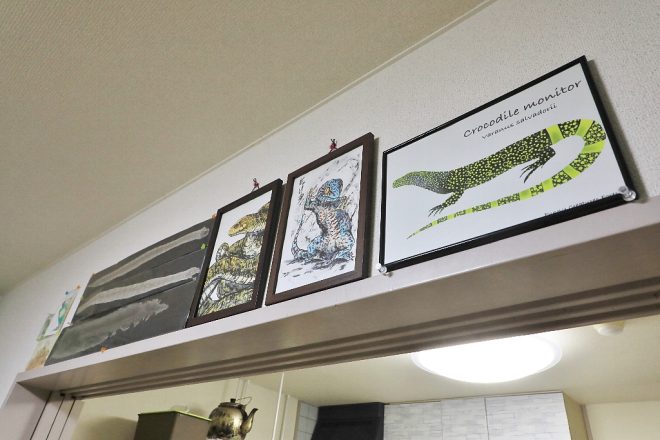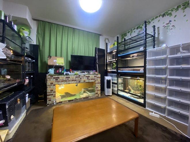 ここに写っているものすべてが動物たちのおうち。暖炉っぽく写っているのも実はトカゲのおうち。部屋はここだけではないのに、「夜は机を取っ払ってここに布団を敷いて寝ています」と話す龍ノ輔さん。好きなヘビやトカゲに囲まれながら毎晩眠りに就けるからでしょうか、とってもうれしそう(笑)。ちなみにこの部屋はヘビ飼育が中心で、どちらかといえば龍之輔さん担当のエリアです。それにしても、タンスや衣装ケースなどはどこに置いてあるんでしょうね(笑)。