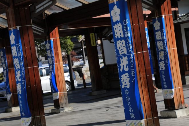 JR湖西線・比叡山坂本駅前広場は、大河ドラマのオンエアを前に少しずつ盛り上がっています。きっとこの地にもドラマが進行するに従って、多くの観光客が訪れることでしょう。