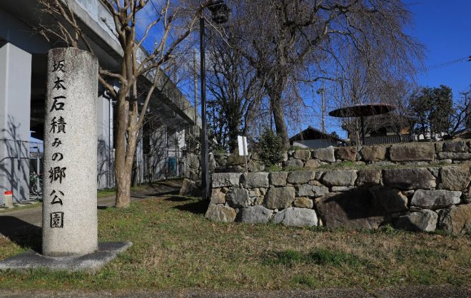 駅のすぐ近くにあった坂本石積みの郷公園。坂本といえば、石垣づくりなどで独自のノウハウを持つ石積み職人・穴太衆のホームグラウンド。それをイメージした公園は、随所に石垣があしらわれていました。