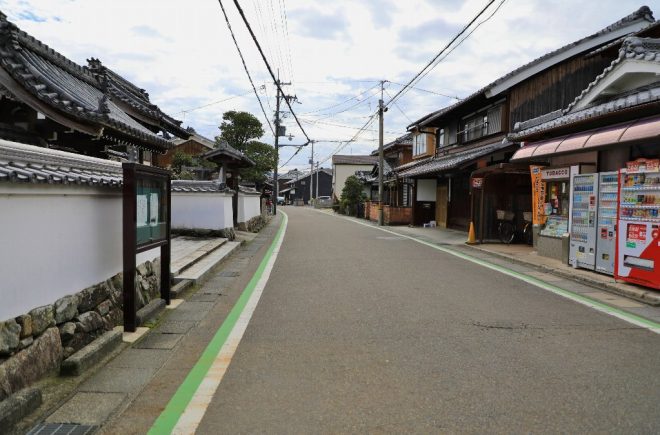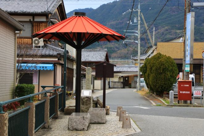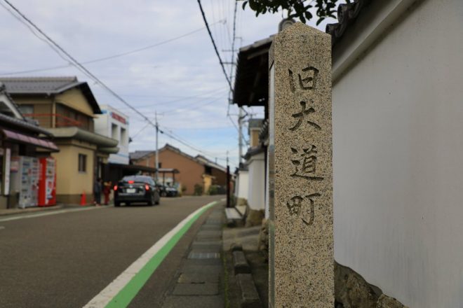 坂本城址の石碑がまちの中にありました。単なる石碑ではなく、まるでお茶の集まりが行われていそうなパフォーマンス。かつては、堺の茶人を招いて坂本城内で茶会を開くことも珍しくなかった光秀。そのワンシーンを再現したような演出が印象的です。