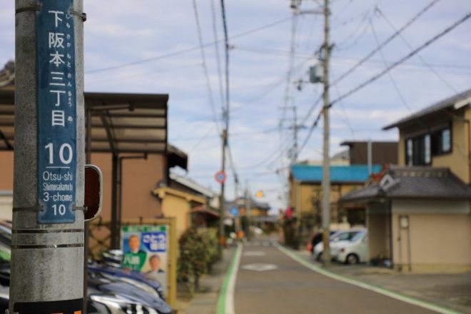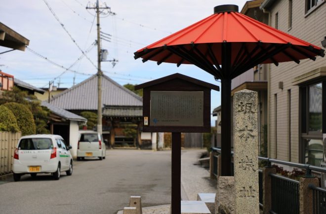 坂本城があったのは、現在の町名でいうと大津市下阪本3丁目付近。坂本ではなく阪本と表記されているのは、「土(ヘン)に返る」という字の意味を地元の人たちが嫌ったからだとか。このため、明治時代に入ってから「坂」を「阪」に変更、現在に至っています。そういえば、大阪もかつては「大坂」でしたが、同じ理由でそうなったという説もあります。