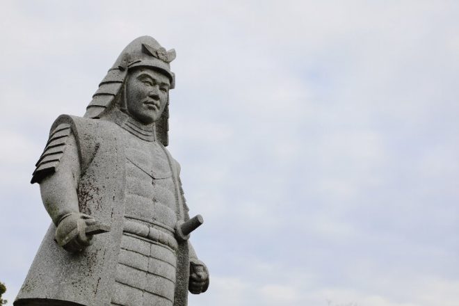 やさしい表情をした光秀の石像が公園内に。武士らしく凛々しい姿ではなく、温厚でフレンドリーな人柄を表しているかのような表情が印象的です。