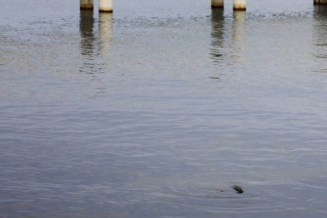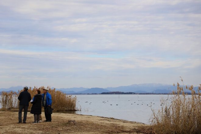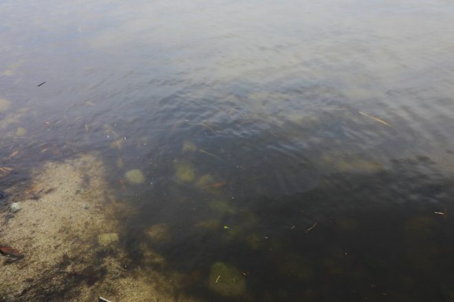目を凝らして湖面をよく見ると、確かにこつごつとした石がいくつも見えます。この下には、おもっと大きな石垣群があるのかと思うと、ますます想像はふくらみます。