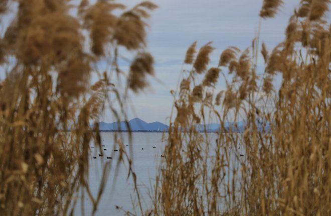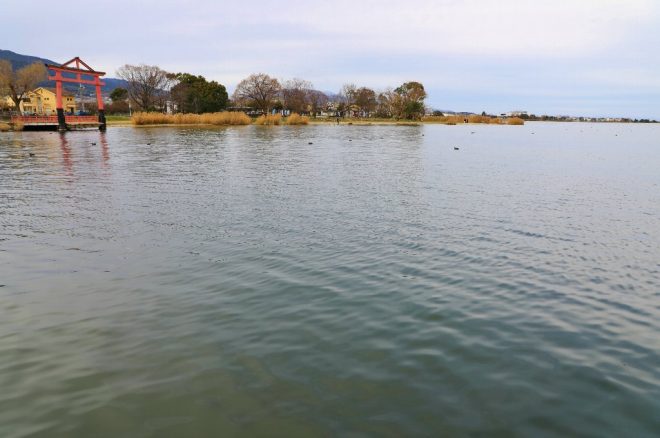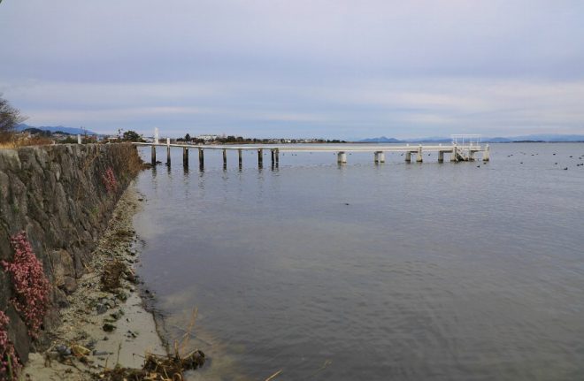 水位の低い冬の時期だからでしょう、石の一部がほんの少し湖面から不自然な姿を現しています。大渇水があるまではまったく姿を現さなかった石たち。誰も気づかなかった本物の石垣群。近畿の水がめ・びわ湖の渇水など今後も起きて欲しくありませんが、歴史ファンならずとも石垣群をまた見てみたいと思う気持ちとの交錯。揺れ動く心の機微は、まるで何かと謎の多い光秀の生涯を表しているような気さえします。