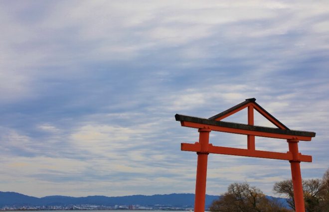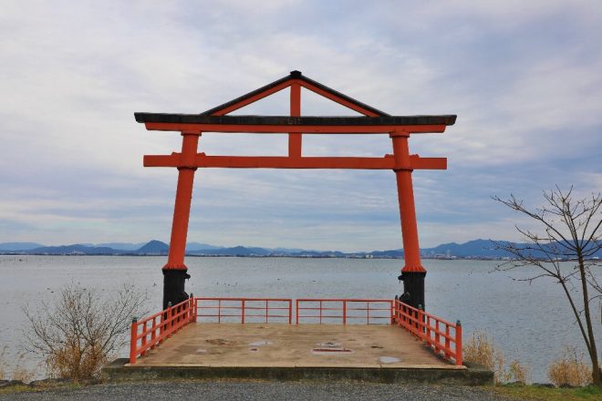 湖畔にたたずむのは、日吉神社の「山王鳥居」と同じテイストでつくられた、いわば山王鳥居のレプリカとでもいうべきもの。ここは、毎年4月に行われる日吉神社の船渡御の舞台にもなる場所。この桟橋から数基の神輿が湖上に出ていく神事が行われます。光秀が城主だったころも同じ神事が行われていたとしたら、戦いのない平和な日本を祈っていたのかも知れません。