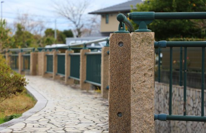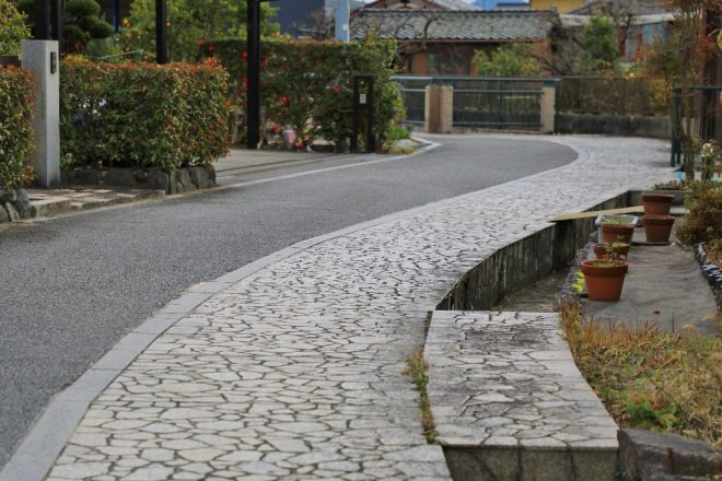 現在は雨水や下水道などのライフラインが整備され、ちょっとした遊歩道風になっています。よく見ると、その模様は築城の土台でもある石垣をモチーフにしているようにも映ります。