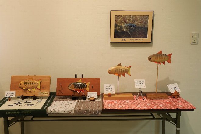 イワナやブナなどをアルミ合金でつくったレリーフ各種。