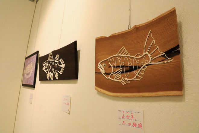 ロープワークによってつくられたヤマメやアロワナの壁掛け。