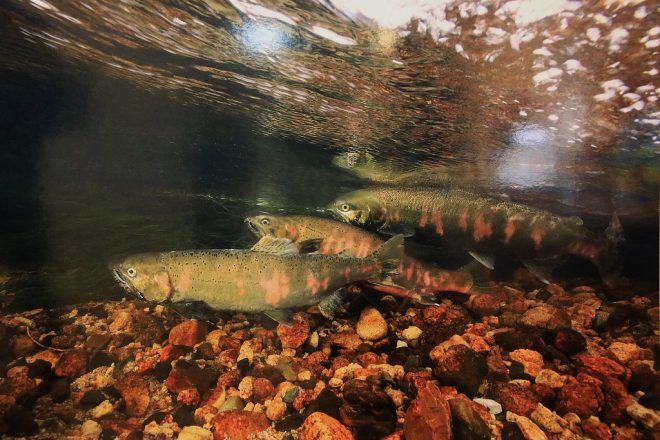 おお~、いきなりダイナミックなブースに遭遇!通路をはさんで左側がニュージーランドで撮影された写真、右側がびわ湖に生息する固有種・ビワマスを中心にした写真で、こちらは去年びわ湖博物館でも展示され、のべ40万人の目にとまって大反響を呼んだのだそうです。