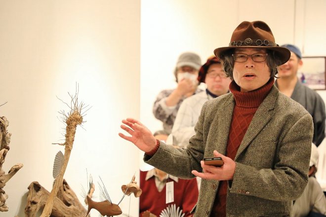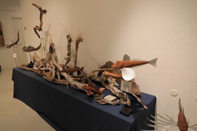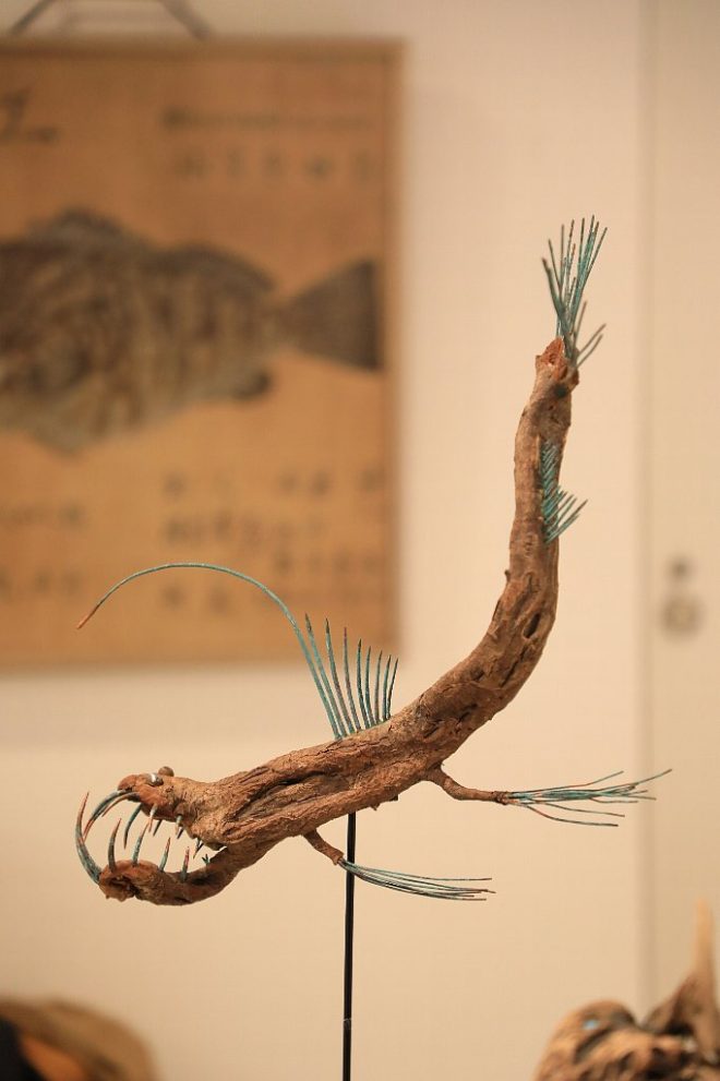 こちらでは流木が展示されています。かなりアクアに近いシチュエーション(笑)。和歌山県の煙樹ケ浜海岸で見つけてきた流木を、古代魚やタツノオトシゴに見立ててアートに。多少は演出パーツの付け足しは多少ありますが、原型は流木そのまま。創造力がモノをいう展示物です。