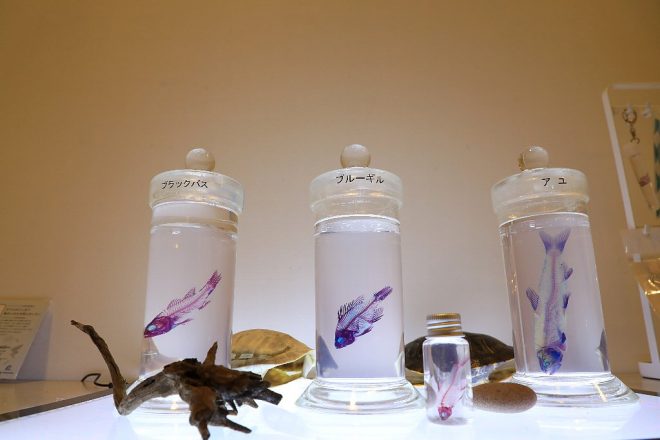 まるで理科室の実験のような展示物。廃棄処分されてしまった魚を、特殊な加工方法で色鮮やかな透明骨格標本にして蘇らせました。小さな魚ではありますが、骨格のひとつひとつがハッキリ見てとれます。単に美しいというだけでなく、子どもたちの教材としても価値ありとみました。