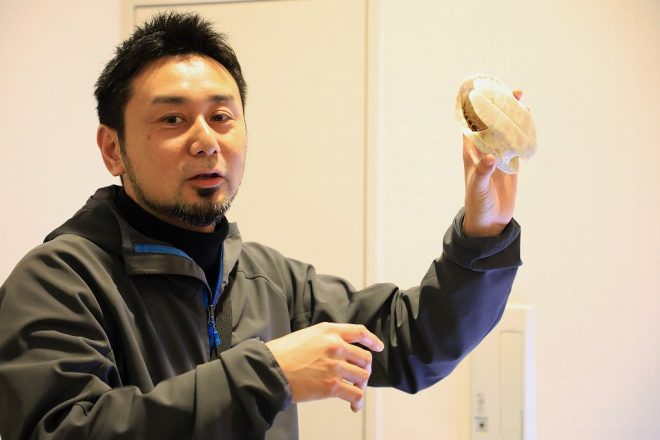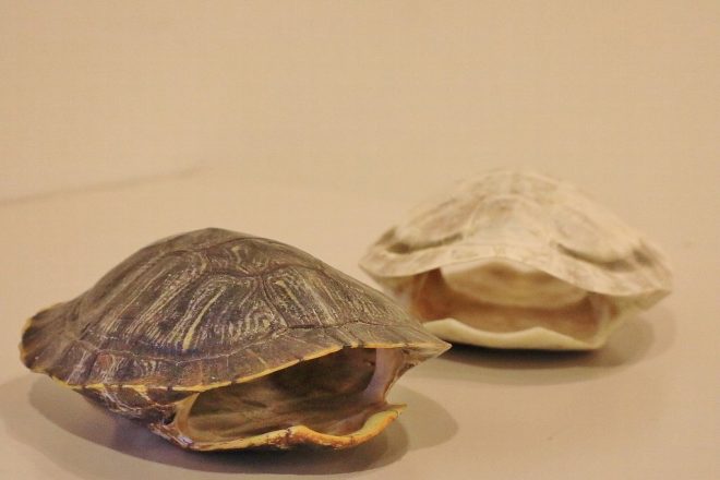 「これって、小動物や魚のシェルターとして使えません(笑)?」と松前さん。あー、それいいかも。外来種として駆除が盛んなアカミミガメの甲羅を、珍しい骨格標本として展開していきたいとのこと。中をのぞくと、しっかり背骨があります。こういうのが教材に役立つんですよね。「現在、アイデア募集中です」(松前さん)。