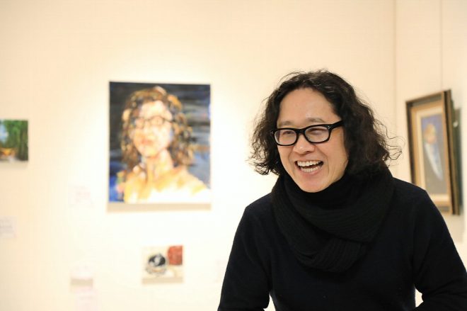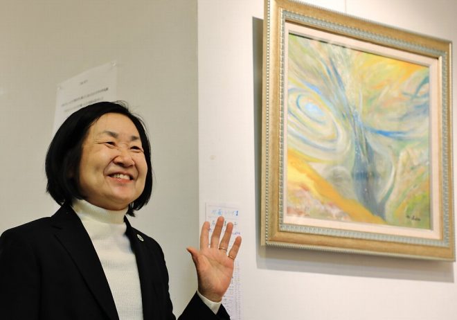 アメリカ在住の石村美佐子さん。一見、小学校か中学校の校長先生のような穏やかで包容力もありそうなキャラ(笑)。ところが何と現地ではフライフィッシングウーマンとして、数々の賞もゲットしておられる人なんです。「水面に映る景色が好きで、川の中の魚をみつけるとうれしくなるんです」と笑顔が素敵な石村さん。自身の油彩画を解説してくれるたどたどしい日本語も、いかにもアメリカンでした(笑)。