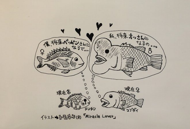 ん?なんでこんなキャプが(笑)?2匹を魚拓にしたキャプなんですが、かつてのマダイの生息エリアを最北(オス)と最南(メス)で示し、ちょっとした遊び心も加えたのだそう。てっきり熊本さんの実体験かと思いました(笑)。
