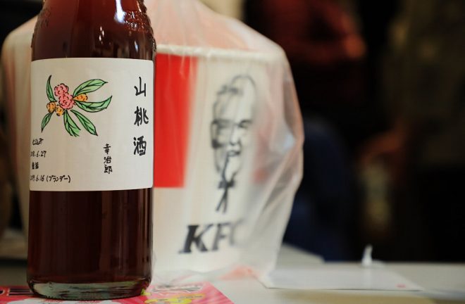 会場にはさまざまな差し入れが。特筆すべきは手前のお酒。何と自作の山桃酒。来場者の藤林幸次さん(京都市)が数年前から自分で果実を摘み取って酒づくりに励んだのだとか。もちろん国税庁公認。一体どんな味がするのでしょうか、カーネルサンダースおじさんも興味深そうです(笑)。来年もまた違う種類の果実酒をつくって届けてくださるそうですので、来年もまた取材に行かなきゃ(笑)。
