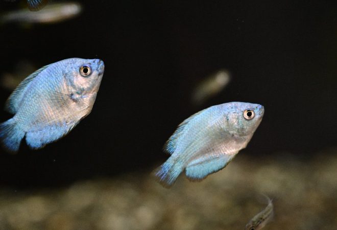 キュートでずっと見ていても飽きないコバルトワーフグラミー。ほかの魚との相性を気にしないといけないゼブラダニオとも混泳中。