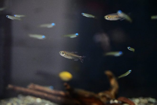 コンゴテトラ(手前)と、ランプのように青く光る目が特徴的なアフリカンランプアイ。