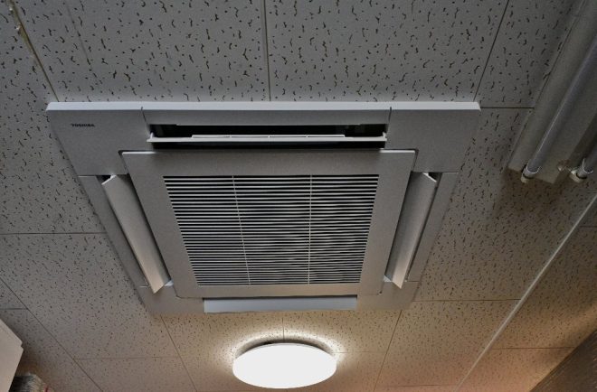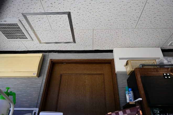 通常より出力は大きめのエアコン設備。入口や壁が西側に面しているため、夏の西日対策でもあります。