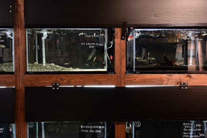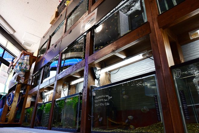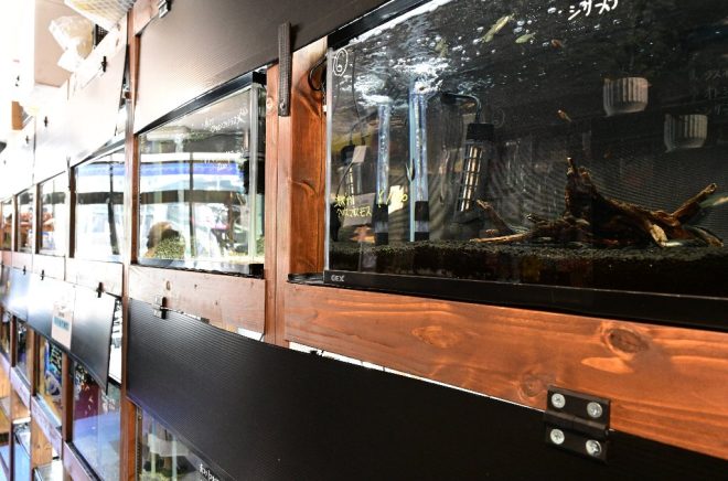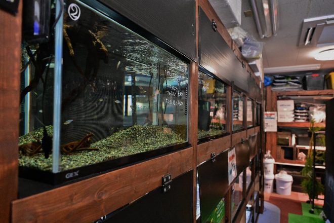 店の一番奥にはカラの水槽が上下に1つずつ。「上の水槽にはサンゴを、下の水槽には海水魚を投入する予定です」。まだ少し時間がかかりそうですが、これが完成すれば一区切りつくと同時に、店としても大きな前進であることには違いありません。