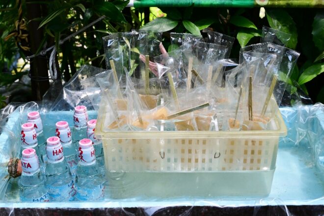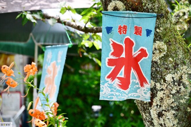 キワメテスタッフの推しはオリジナルスイーツ。この日は、梅ゼリーと柚子入りアイスクリームのオリジナルスイーツ。もちろん明美さんの手づくり。それでいてたったの300円。ほかにも、かき氷やスイカ、各種ドリンクもほとんど300円までと超リーズナブル。観光地とは思えない、まるで町内会のお祭りレベル価格は、まさに人に教えたくない醒井宿のスポットでもあります。