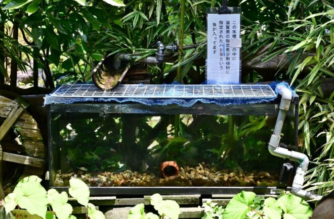 飼育水は地蔵川から引き込んだ水を循環。もちろん水温14℃前後に保たれています。ハリヨにとっては御の字。もちろんブクブクなんかありません。