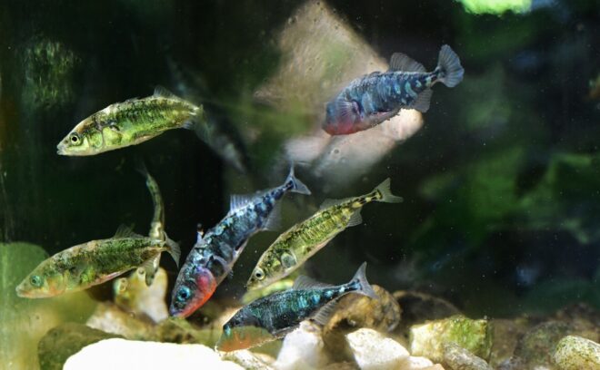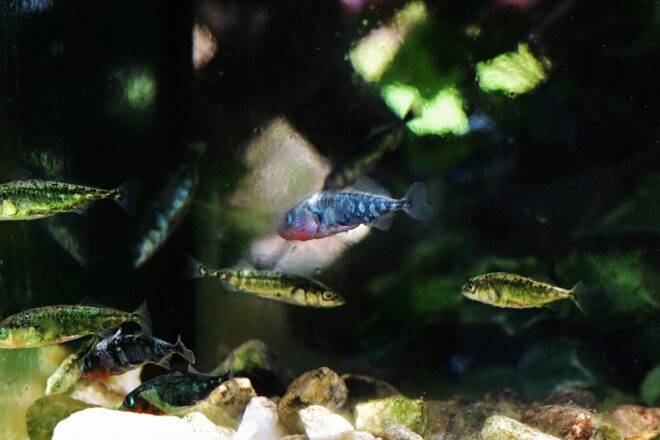 美しい婚姻色を見せるオスも間近で見ることができます。