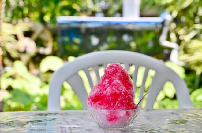 ハリヨを真正面に見ながら氷イチゴなんか少し。