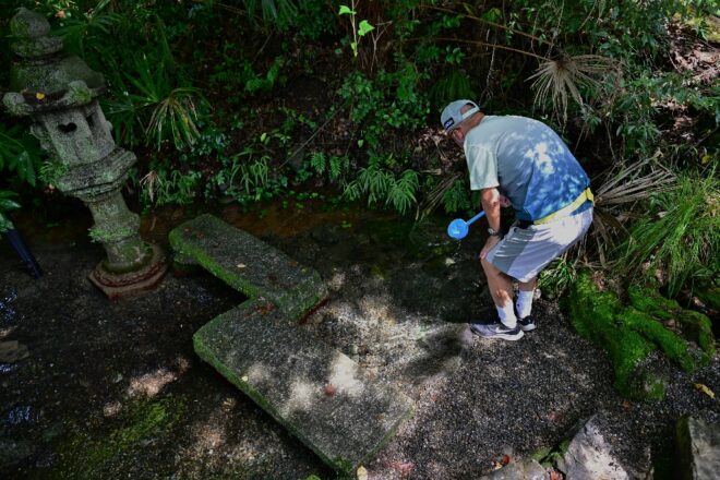 「せっかくやから飲んでみよう」。神戸からお越しのご夫婦のご主人が水辺まて足を運んで早速試飲。どうでしたか?「うん、軟水ですね」。熱烈な阪神タイガースファンだそうです、おーん。