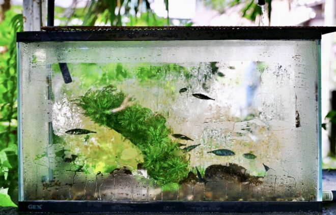 水槽の表面には、水滴がビッシリ。水槽内の水といかに温度差があるかがよくわかります。