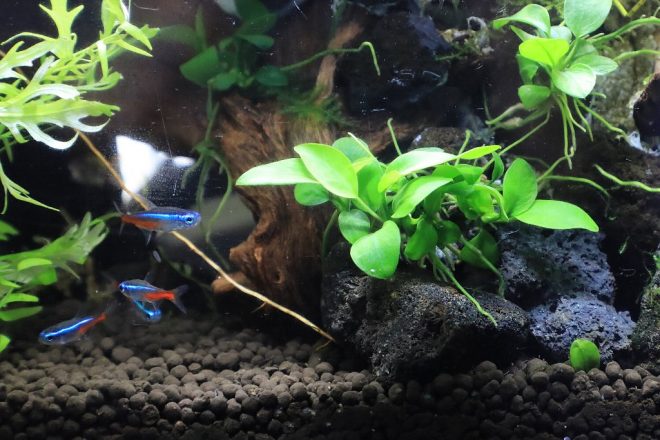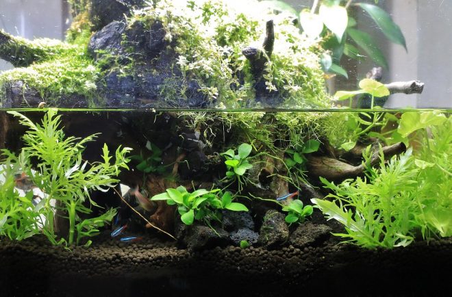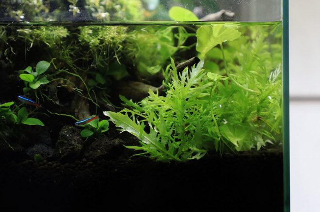 一方の水中葉では、ウィストリア、プチナナ、アマゾンチドメグサなどをあしらい、ネオンテトラやオレンジグリッターダニオなどの小型魚たちと同居。いやー、それにしても水槽がきれい。もしかして昨日掃除した?「はい(笑)」