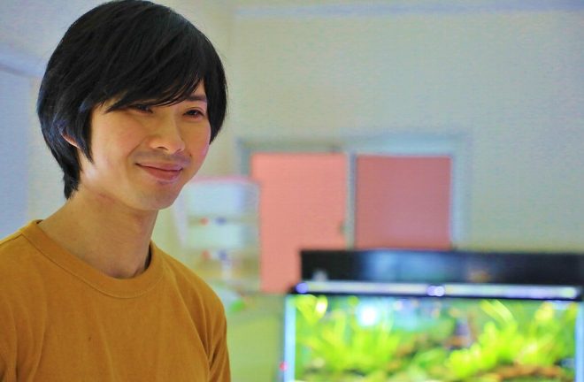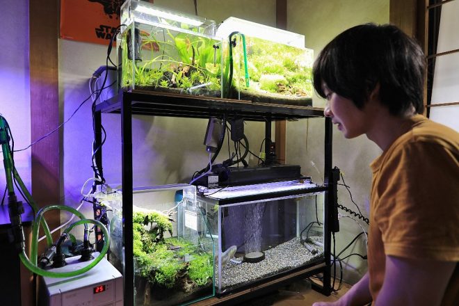 子どものころから生きものが好きで、アクア系の専門学校を卒業してから趣味も仕事もアクア一筋。好きなことを仕事にしている、イマドキの若者のライフスタイルがうらやましすぎます。寝ても覚めてもカノジョといても、頭の中はいつもアクアでいっぱい(笑)。27歳のアクアリスト。有り余る情熱と創造性を持ちながら、客観性も忘れないオトナな一面も。独自のこだわりと信念と。そんな世界観をかいま見るべく、自宅訪問となりました。